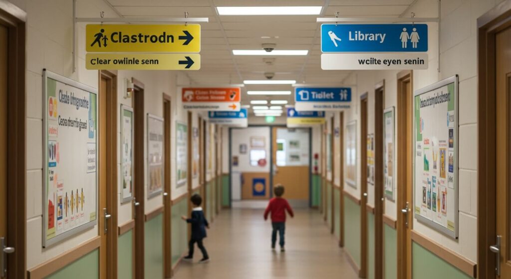 A child-friendly sign uses bright colours, simple words, and playful icons. Wayfinding signage design for children often includes arrows, shapes, or animal figures. These signs support non-readers and make school environments engaging and accessible.