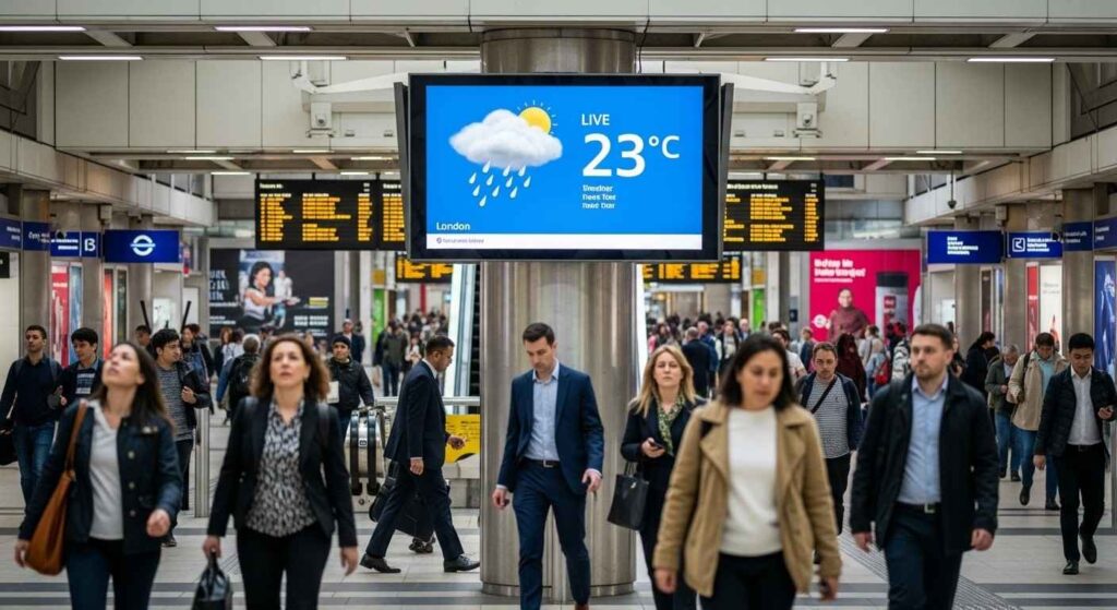 Placement matters when using weather data in signage content. High-traffic areas deliver the greatest impact for these updates. Entrances, waiting areas, and transport hubs are ideal for real time weather display signage. UK surveys show commuters in London and Manchester spend many minutes daily viewing public screens. This highlights the value of placing weather data where attention is already high. Timing also plays a critical role in message effectiveness. Showing umbrellas before a storm feels more powerful than after rain begins. Businesses must align screen schedules with consumer routines and weather patterns. Positioning ensures maximum visibility and impact for every campaign.