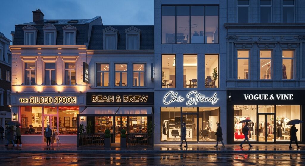 - Illuminated built-up letters supporting visibility for evening businesses